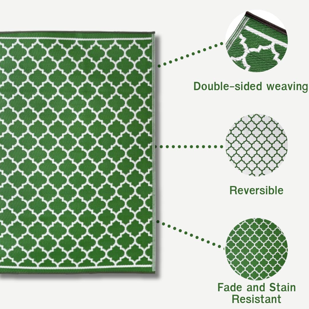 This Green Delight Patio Rug is a versatile and durable addition to any outdoor or indoor space. Made from recycled polypropylene, it is UV and fade resistant, making it perfect for patios, decks, offices, and living rooms. Its double-sided weaving adds to its multipurpose use, and its easy-to-clean and store design makes it a convenient choice. Simply roll it up and store it away when not in use.