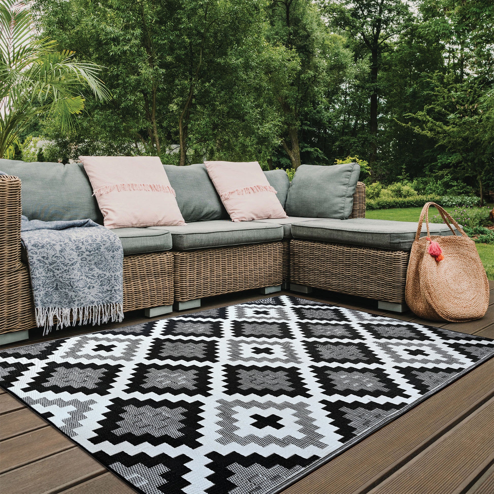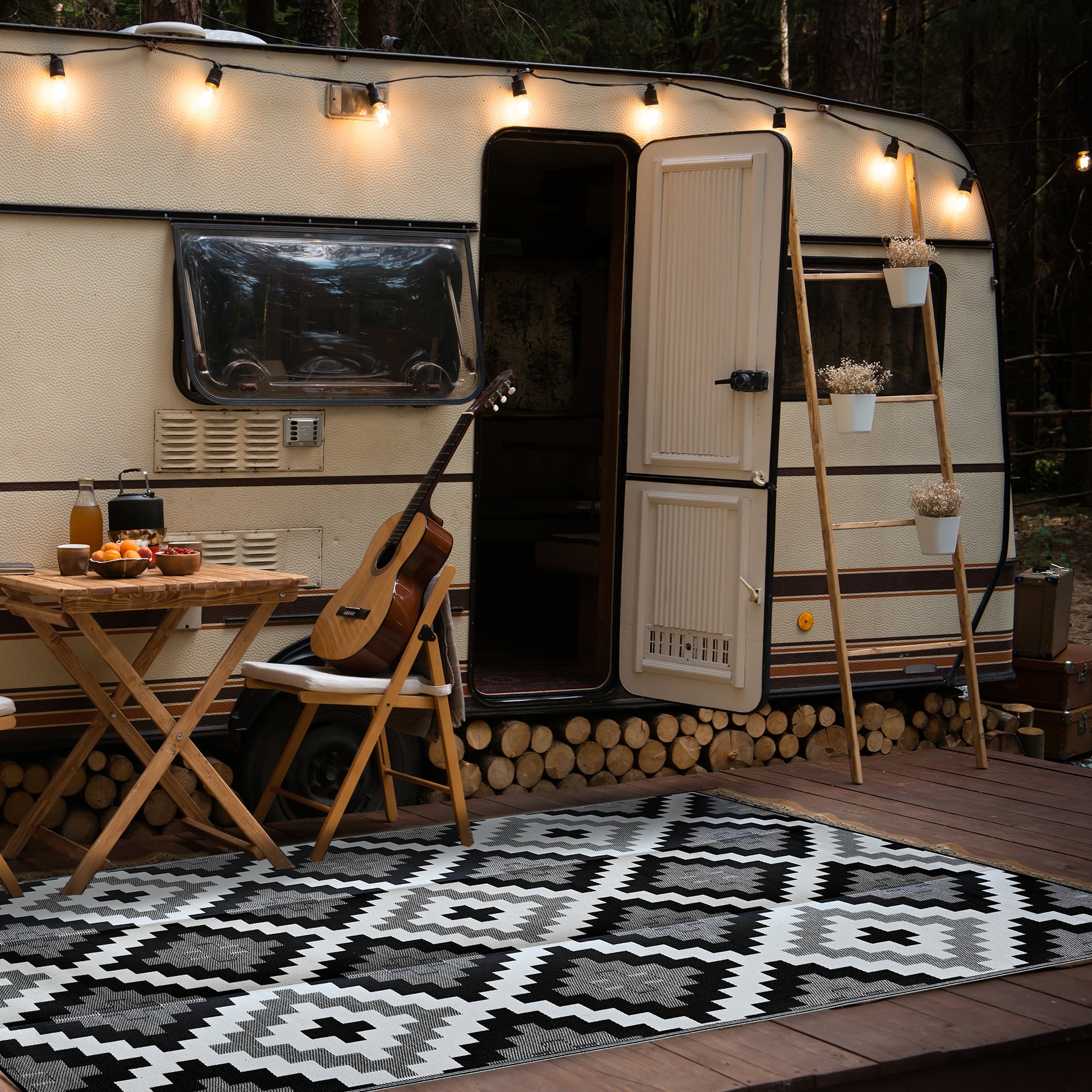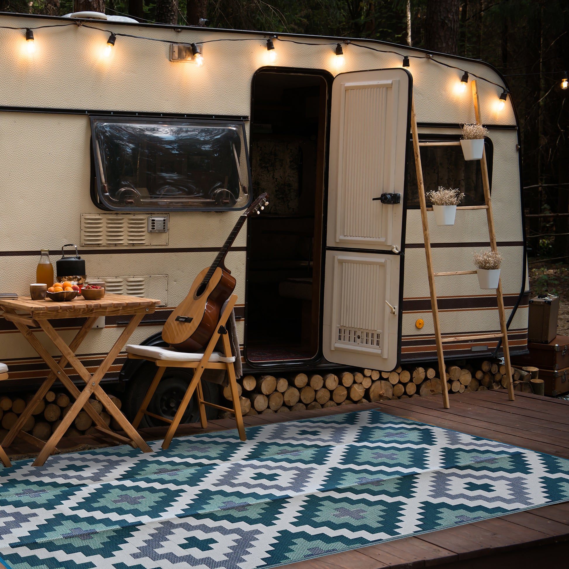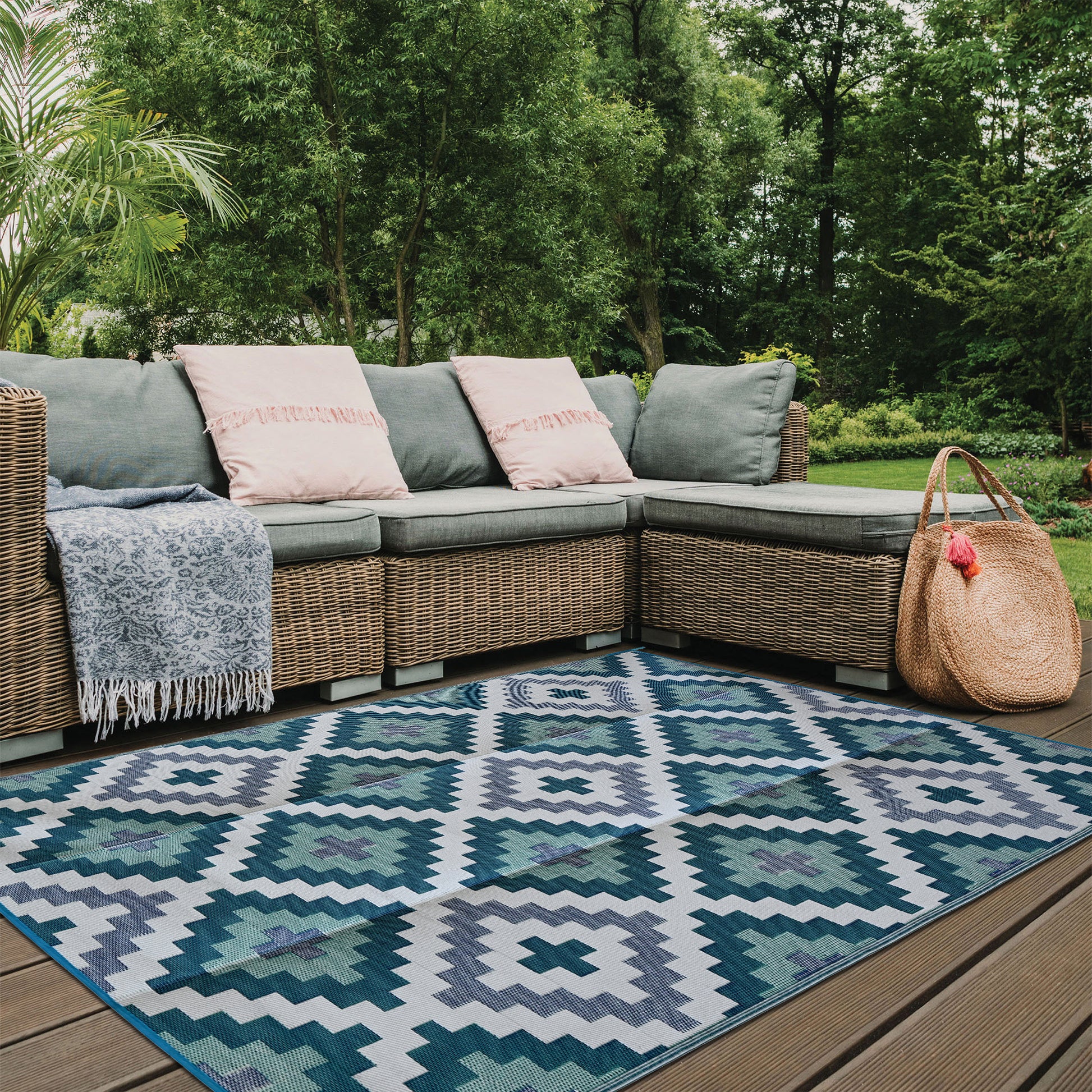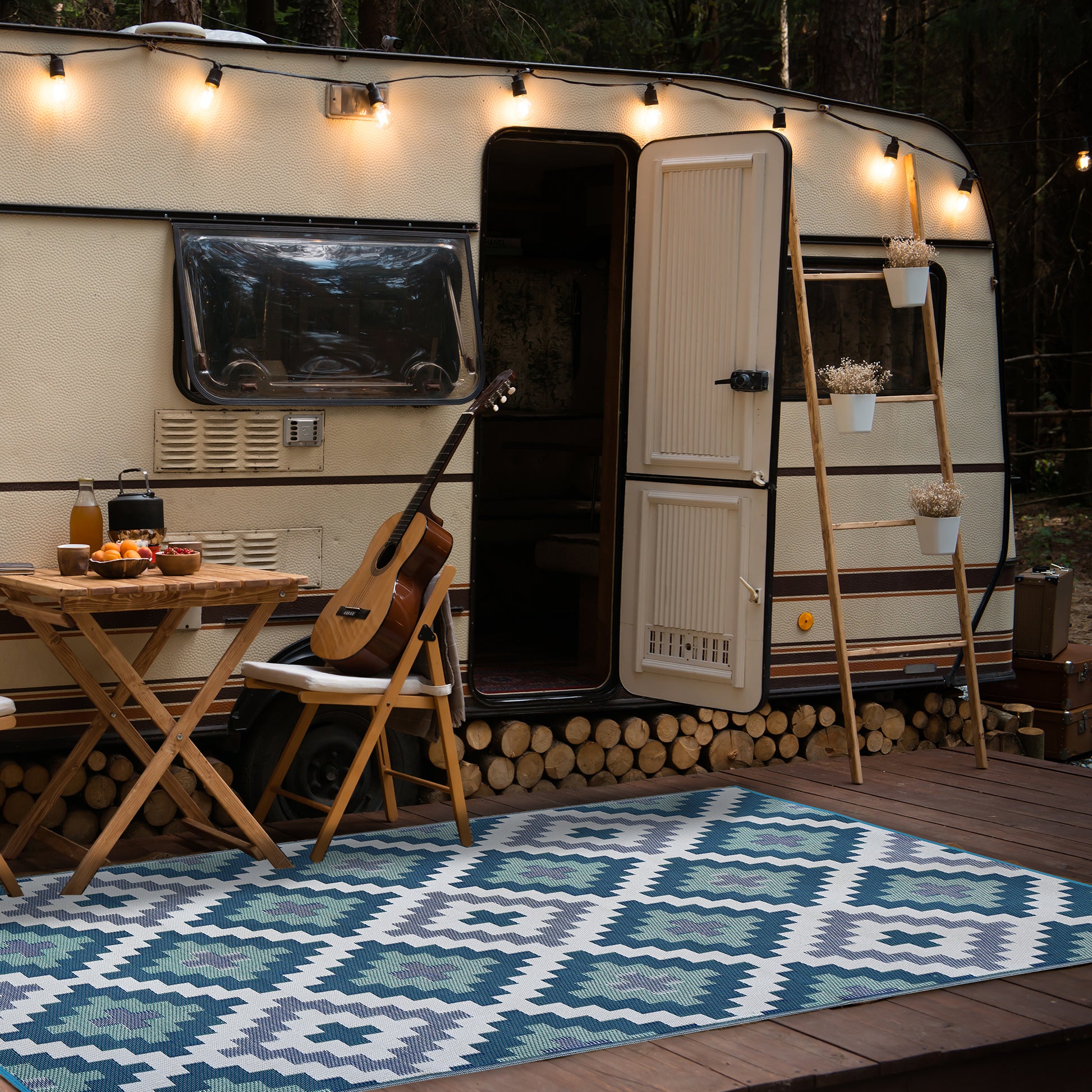 This Kilim Design Patio Rug is a versatile and durable addition to any outdoor or indoor space. Made from recycled polypropylene, it is UV and fade resistant, making it perfect for patios, decks, offices, and living rooms. Its double-sided weaving adds to its multipurpose use, and its easy-to-clean and store design makes it a convenient choice. Simply roll it up and store it away when not in use.